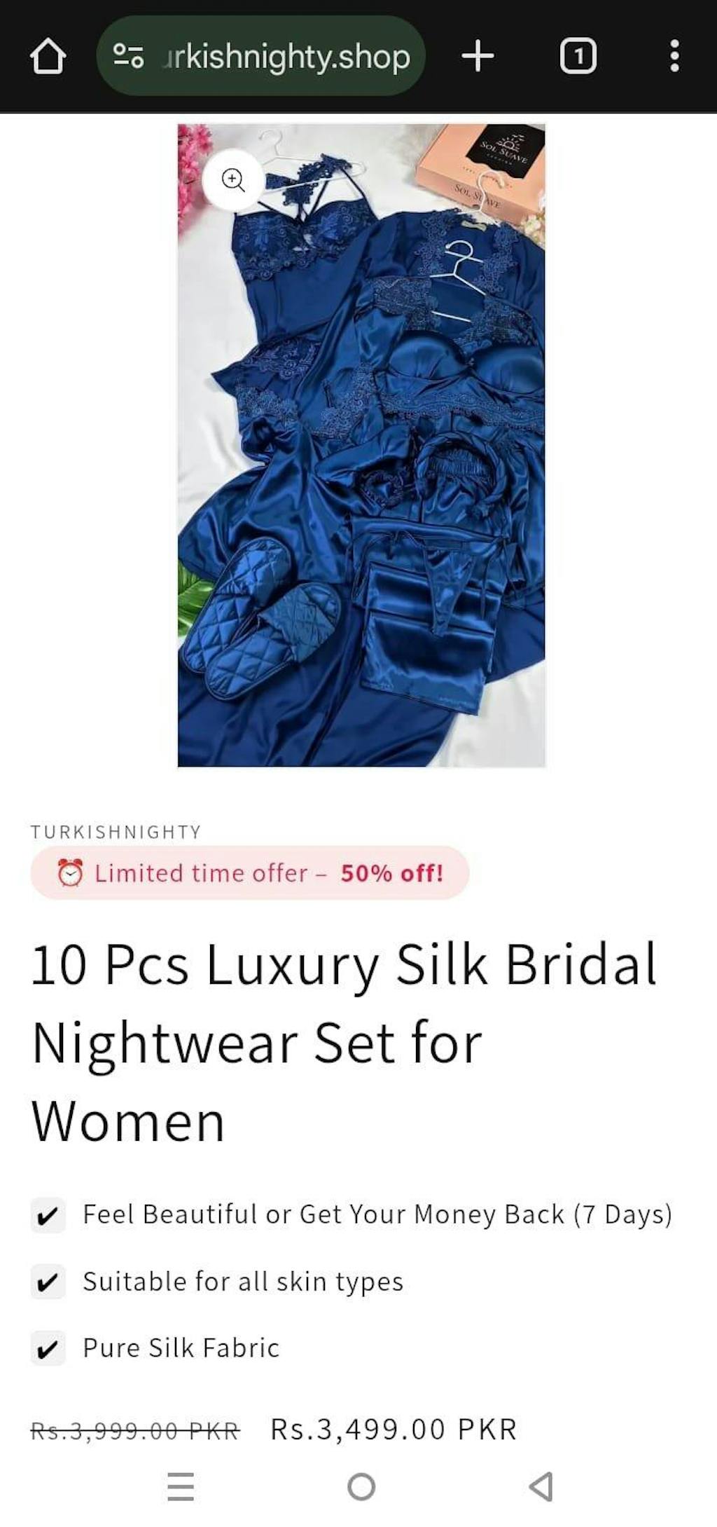Assalamualaikum mai ny pahly stylo pret se apna 10 pcs order kiya tha wo intehai ghatiya quality ka fabroc tha or pcs bhi pore nhi thy or phor mai ny turkishnighty se order mangwaya mujhe pore 10 pcs ka completed set mila hai or fabric bhi wahi hai same quality silk